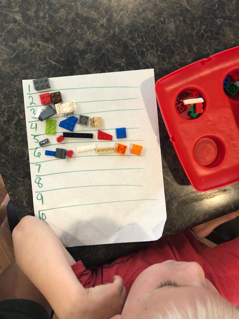 We practiced counting again in the house in a similar way. This time we used Legos.