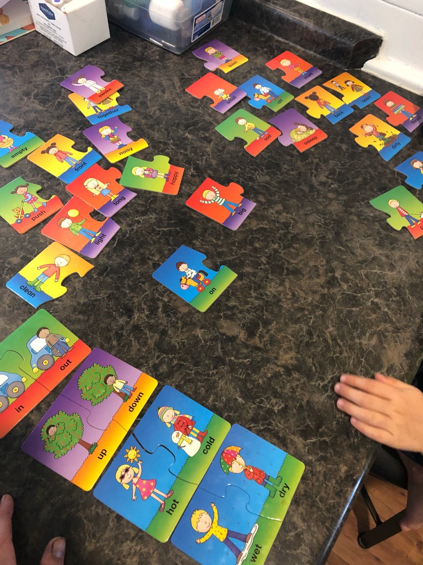 I divided the two opposite cards up, because Sam cannot read. This makes this game more manageable for a five year old.