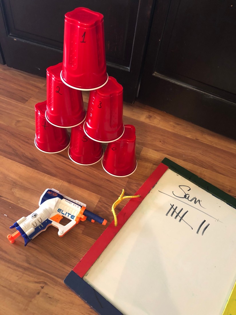 When Sam would shoot a cup, he would tell me the number. Then we would make tallies to count out the number. We continued this game until all of the cups were down.