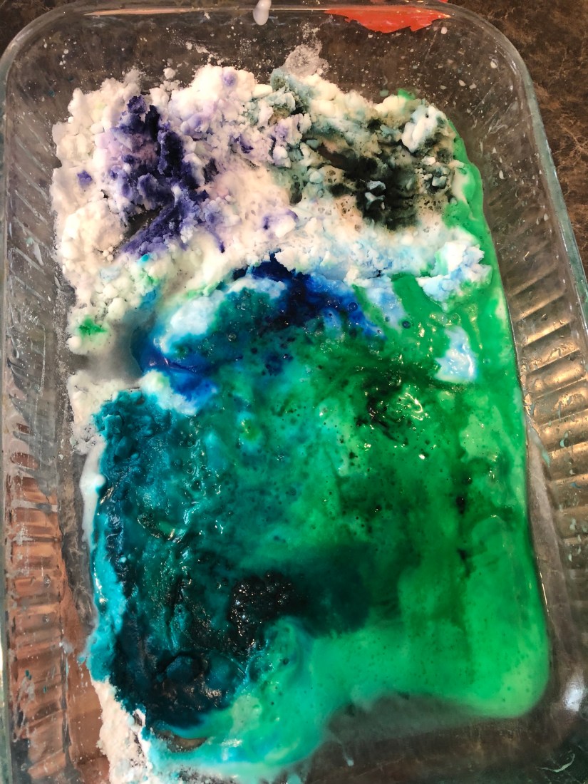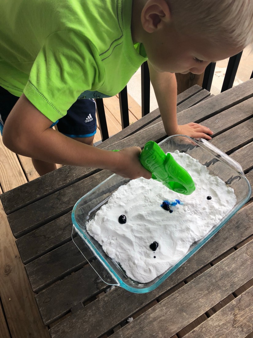 Since we were on a shooting streak, we continued. I filled a shallow pan with baking soda. Sam chose five colors of food coloring and I dropped them in. Then he shot them with a vinegar filled squirt gun.