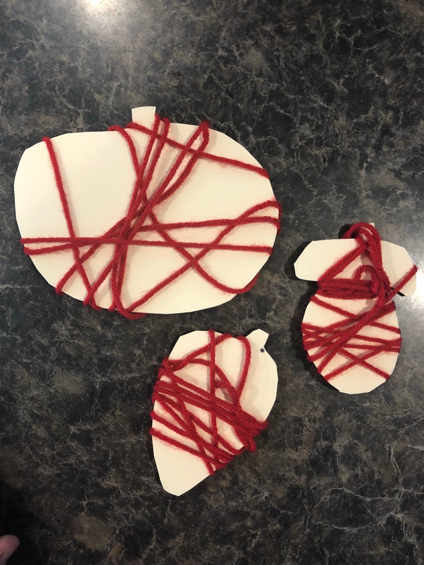 Sam worked on yarn wrapping next. I cut out some shapes from old files. I wanted to use a card stock like material. Then I showed him how to wrap yarn around the shape. Activities like this strengthen his fine motor skills for writing.