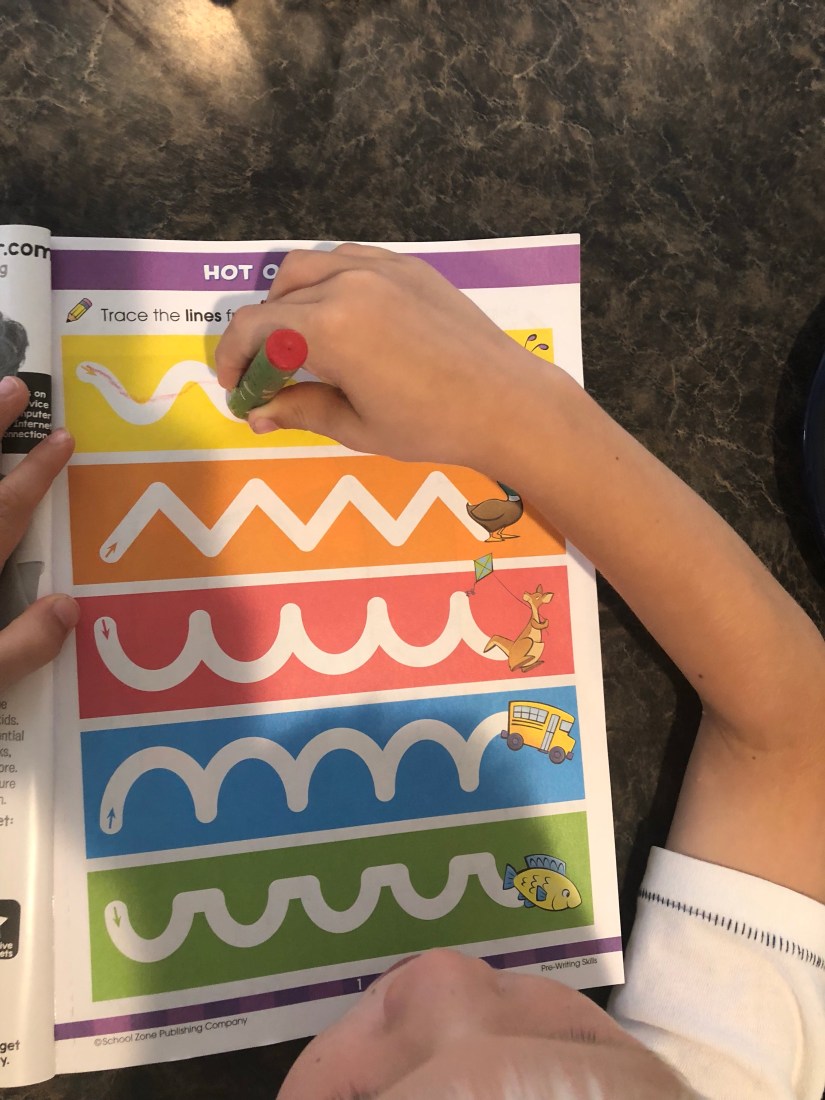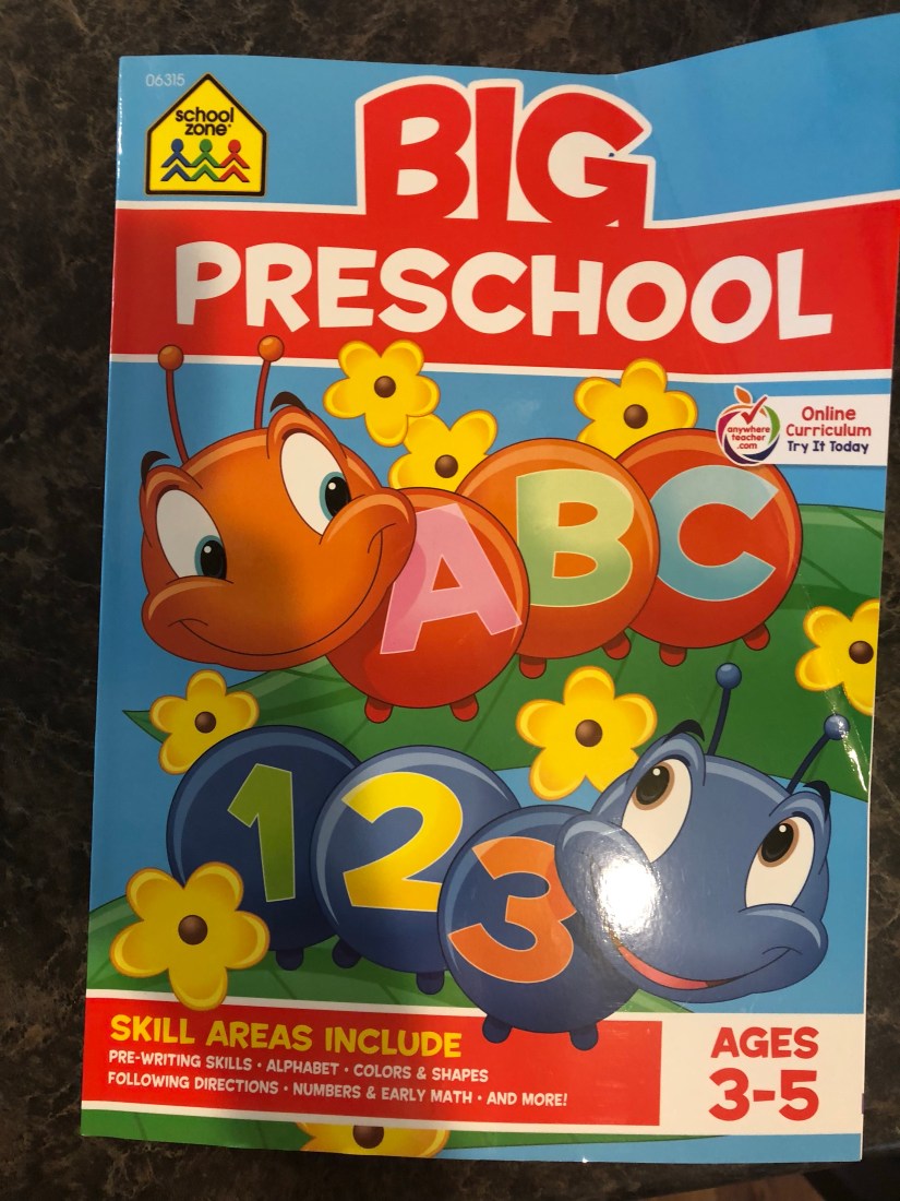For some writing practice, I ordered this preschool book. This might also get brought along in the car and to church.