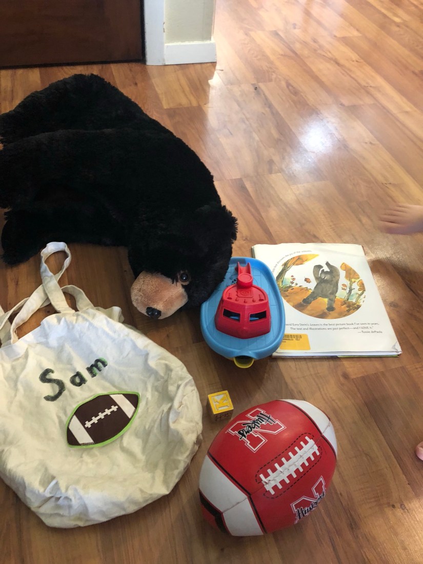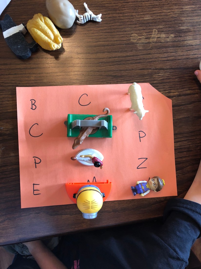 This is such a simple activity. I gathered a bunch of toys. I wrote the first letter of each toy on paper. Then I helped Sam decide which toy should be placed on each letter.