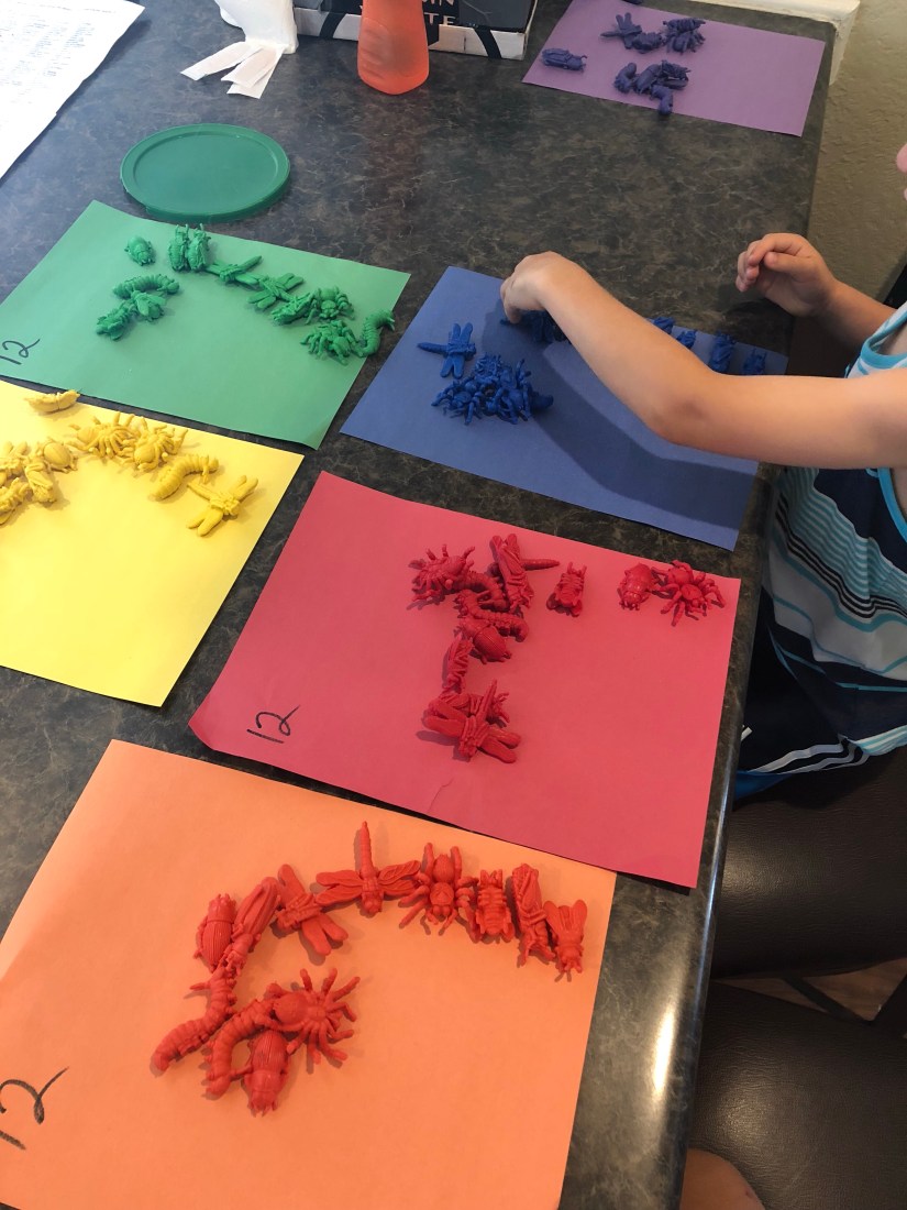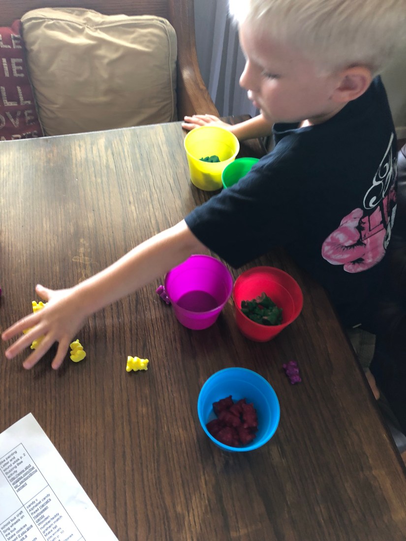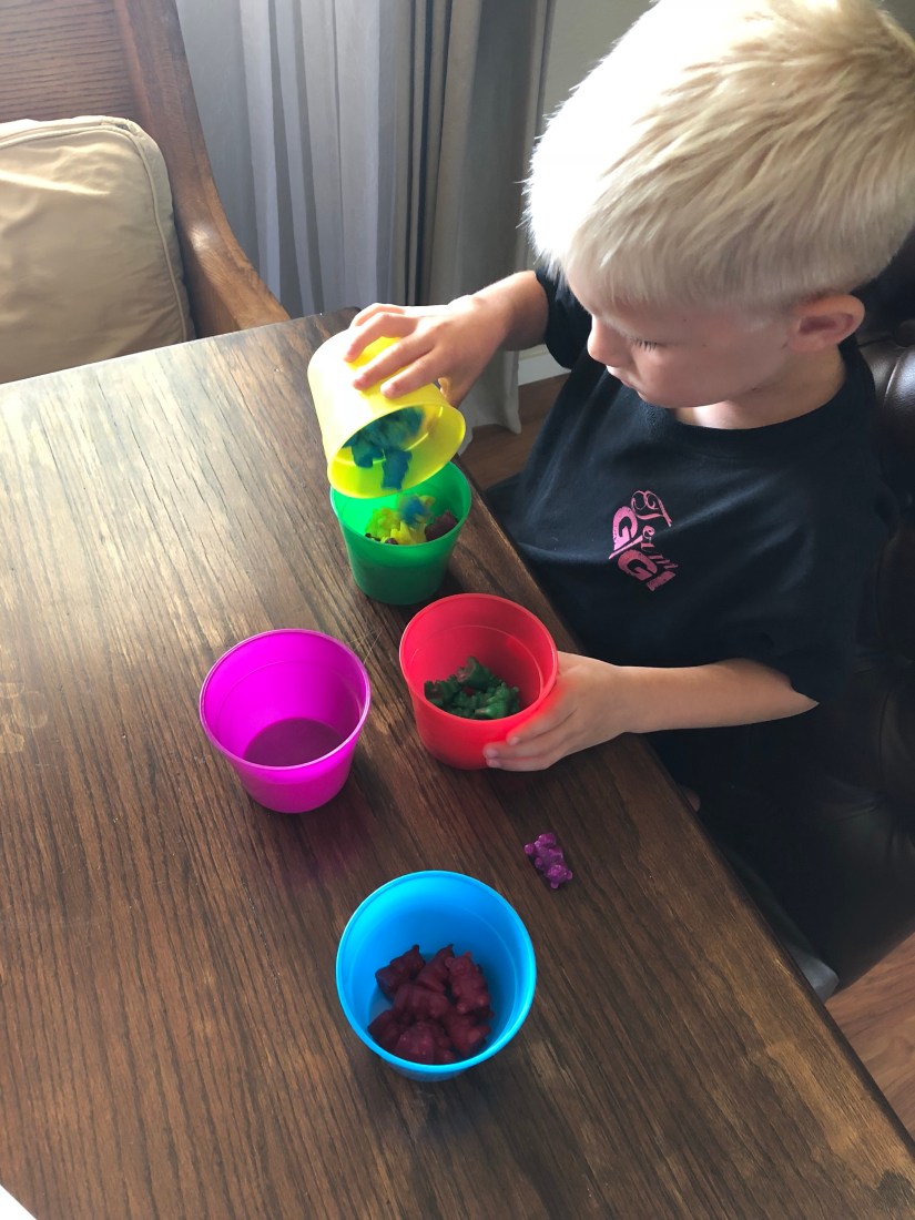 Sam chose to play with the bear counters. He sorted them by color, counted them, and then he poured them.