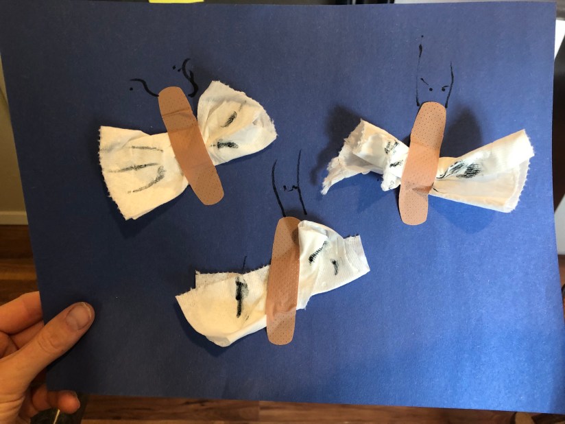 Making band-aid butterflies was next. You could use gauze, we used toilet paper.