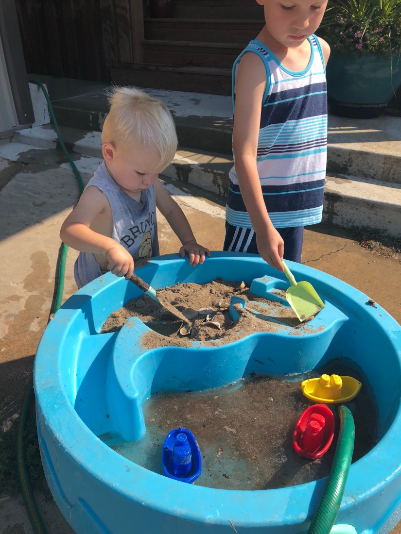 The first activity was beach play. I took our water table and put sand in part, water in the other. I gave the boys shells and boats to play with, also.