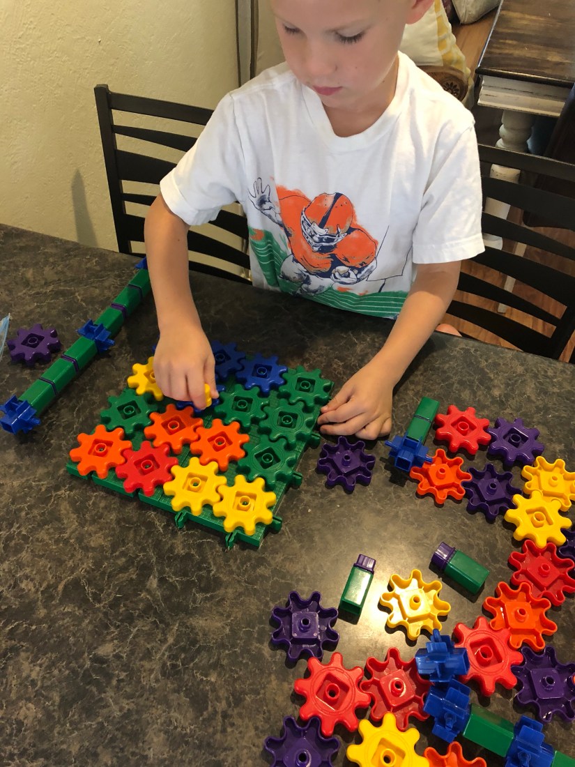 Sam chose to play with gears for his busy activity, today. These gears are a HUGE hit in this house. My boys even make farm equipment with these gears: pivots and tractors.