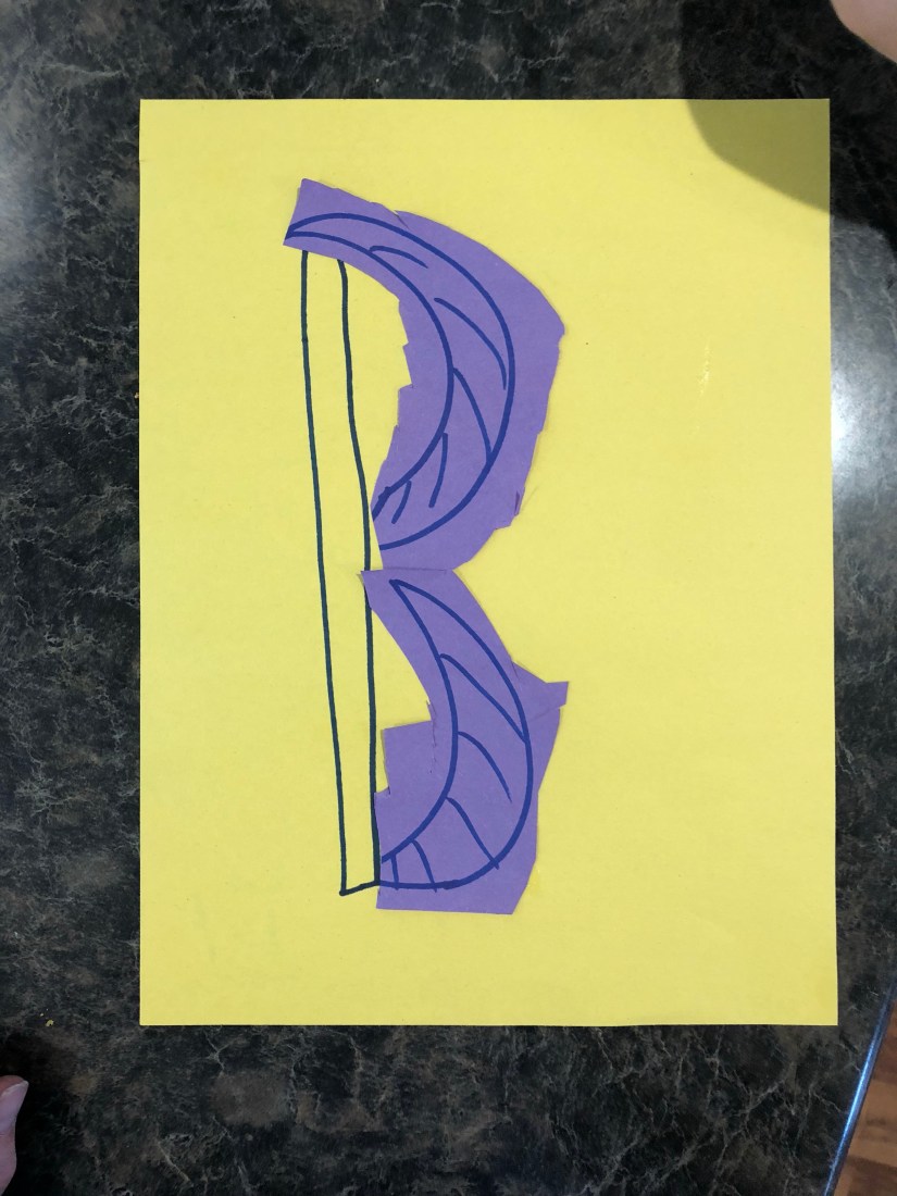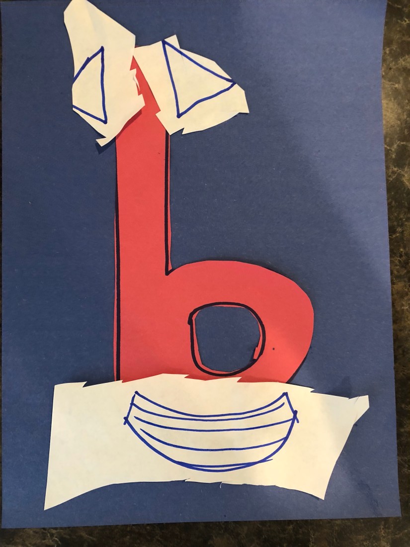 B is for bat. I traced Sam’s hand and cut out the shapes. Sam glued the shapes down.