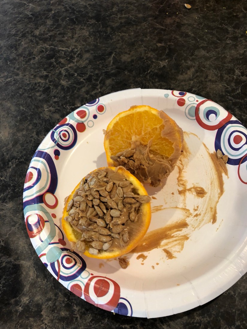 The first activity of our day was making food for the birds. We cut an orange in half, Sam spread peanut butter and sunflower seeds on the orange. Honestly the learning Sam experienced just in spreading peanut butter was probably a days worth of learning. 😉 Then we placed the orange in the tree.