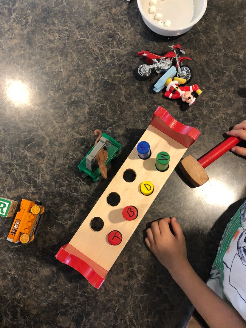 Pound the sound. I set out a toy, Sam decided on corresponding letter and then pounded it.