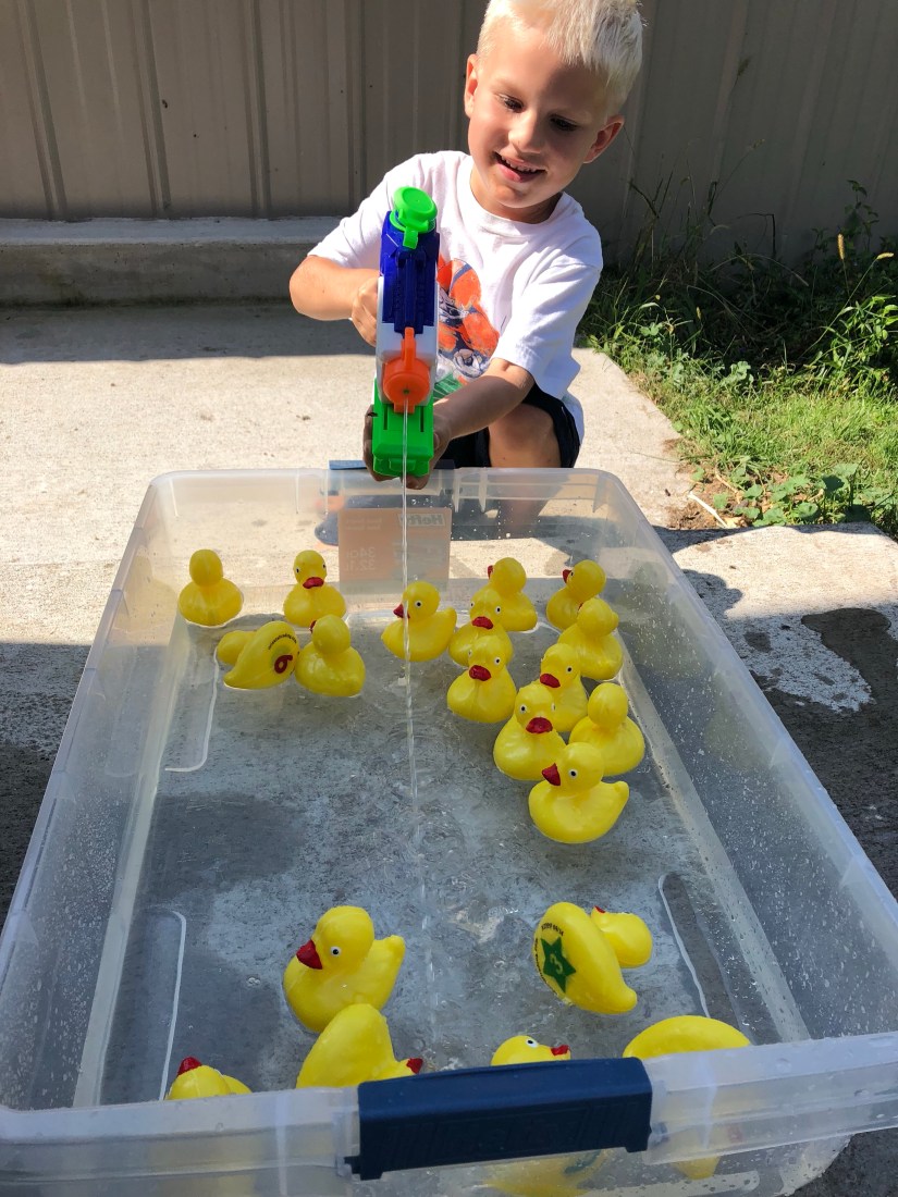 A duck race was supposed to be next, but Sam turned it into shooting the dunks. Boys. Ha! Even so, this is a fine motor building skill.
