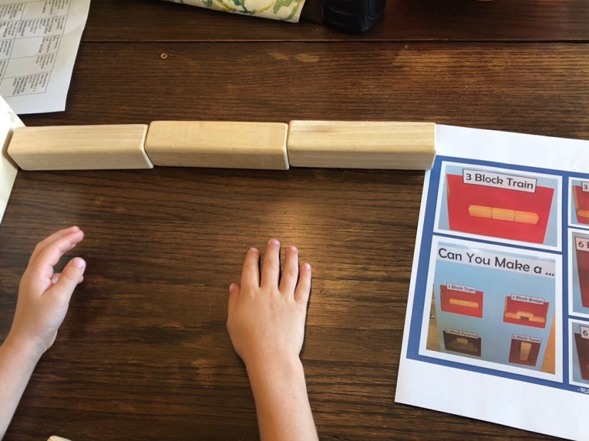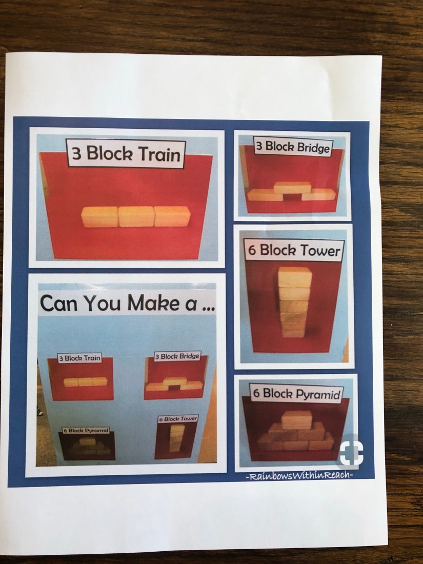 I found this block instruction sheet online. Sam followed the pictorial instructions and built each tower.