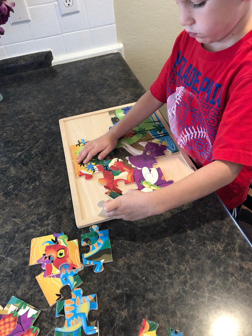 Sam chose a dinosaur puzzle to start our day. This was a perfect puzzle because we started the letter D today.