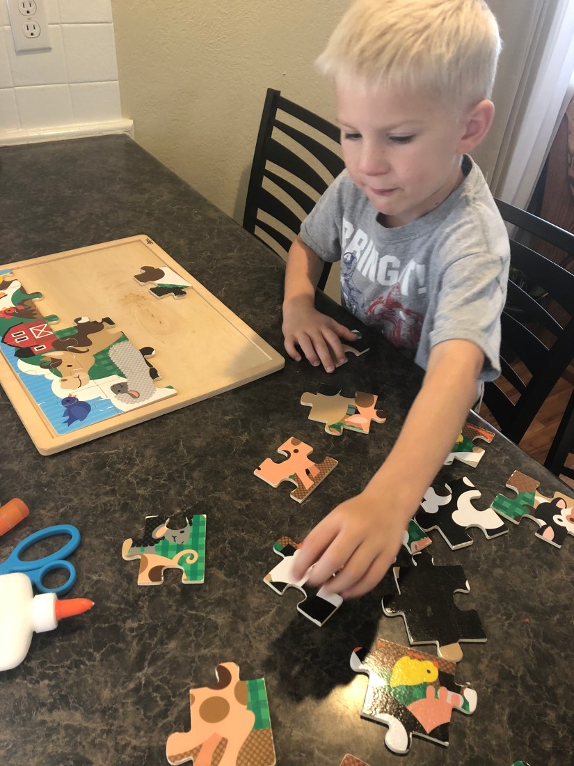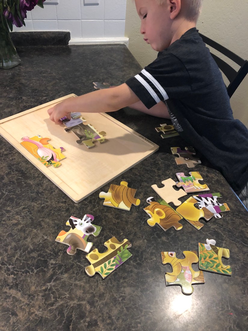 Sam chose a puzzle to start our day.