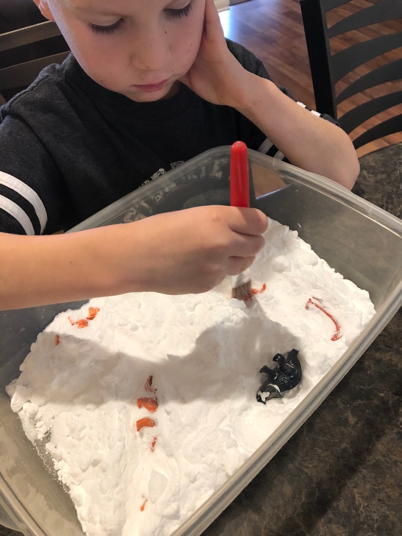 D is for dinosaur dig. I put a bunch of plastic dinosaurs and covered them with baking soda. Then Sam used a paint brush to uncover the dinosaurs. He Loved this activity.