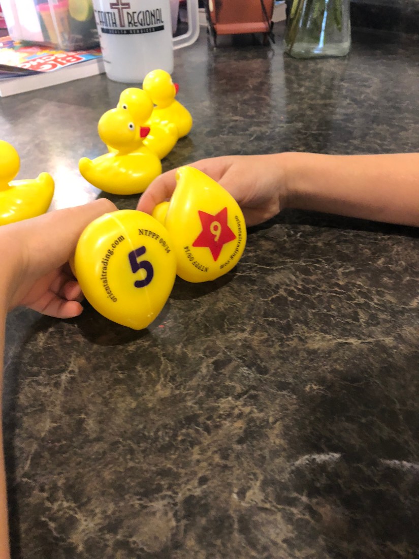 Then we “added” two numbers on the bottoms of the ducks. This was not an activity Sam did independently. This was something we did together, as we counted on my fingers. 😉