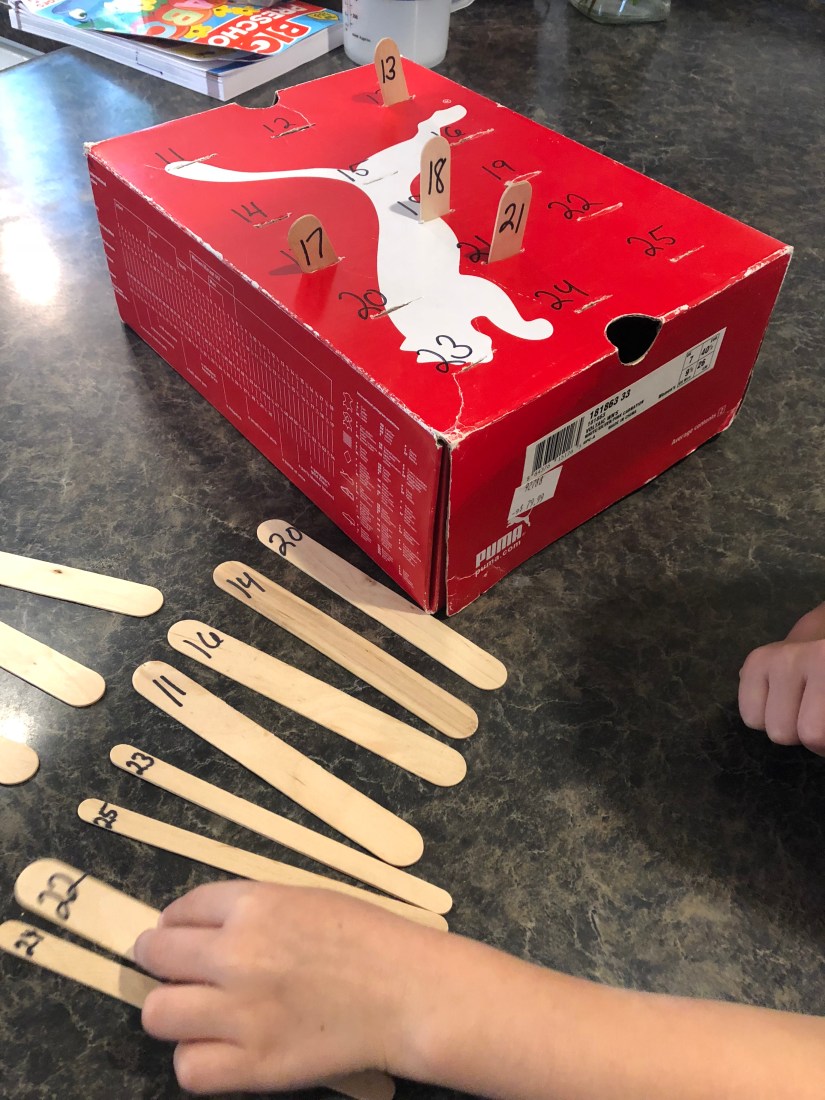This next activity was for number recognition for numbers 11-25. I wrote numbers and cut slits in a shoe box. Then Sam matched up popsicle sticks with the correct number.