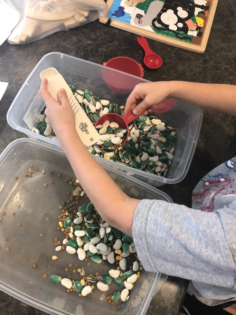 This sensory activity of measuring kept Sam busy for a while. This tub is filled with kidney beans that have been spray painted, some sunflower seeds, and a variety seeds.