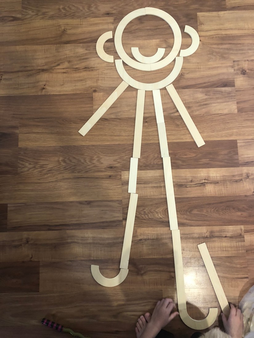 This is Mat Man. We’ve used these wood pieces to build letters. Teaching kids to draw a person is actually a real need. This Mat Man will actually help kids understand. This is not how one is supposed to make mat man, but this is how Sam chose to make Mat Man, today. 😉