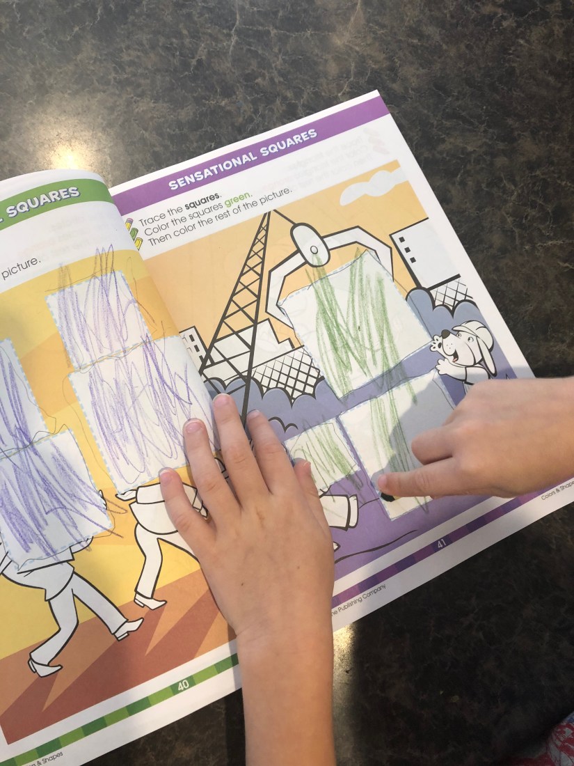 Coloring is NOT Sam’s favorite activity. Our oldest was the same way at this age, now he colors beautifully. So, I’m not going to let this bother me – too much. 😉