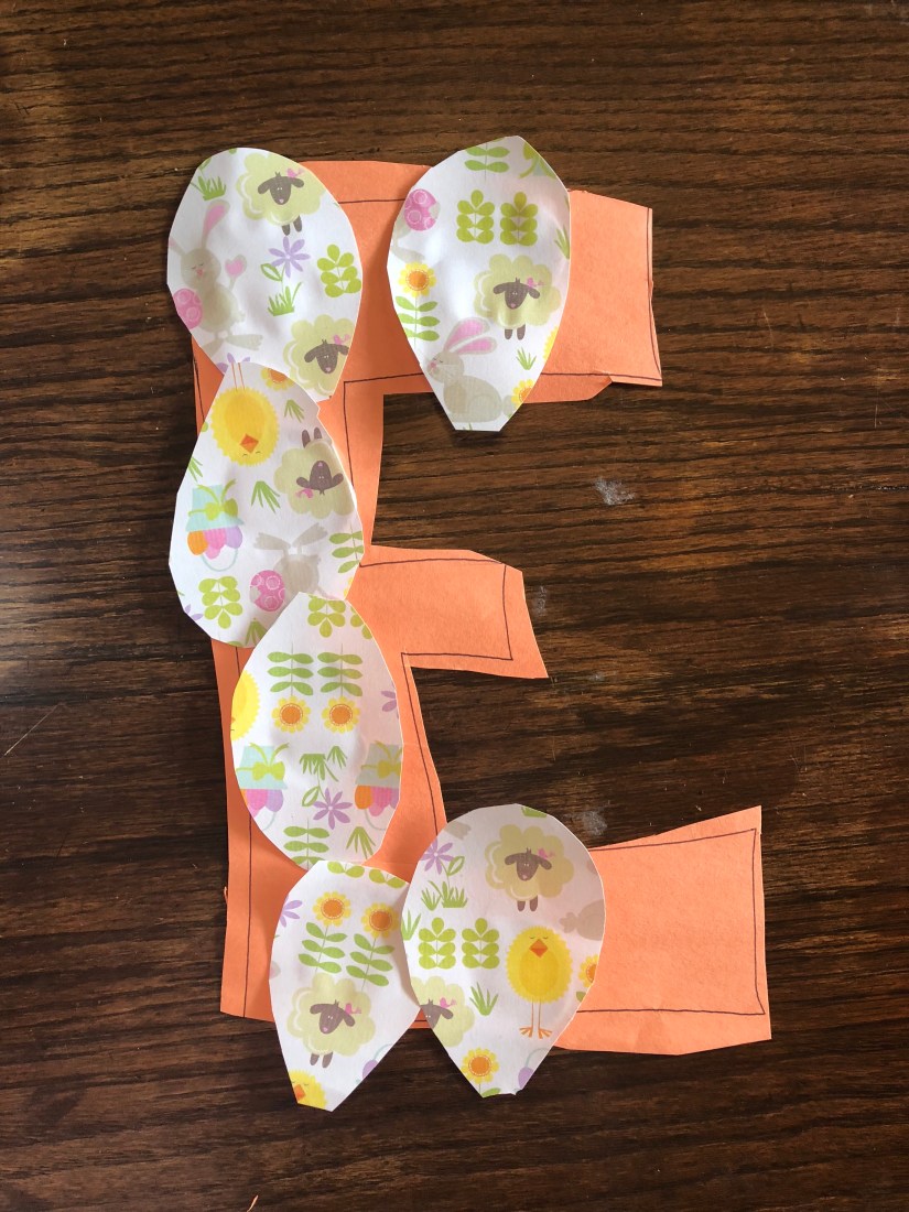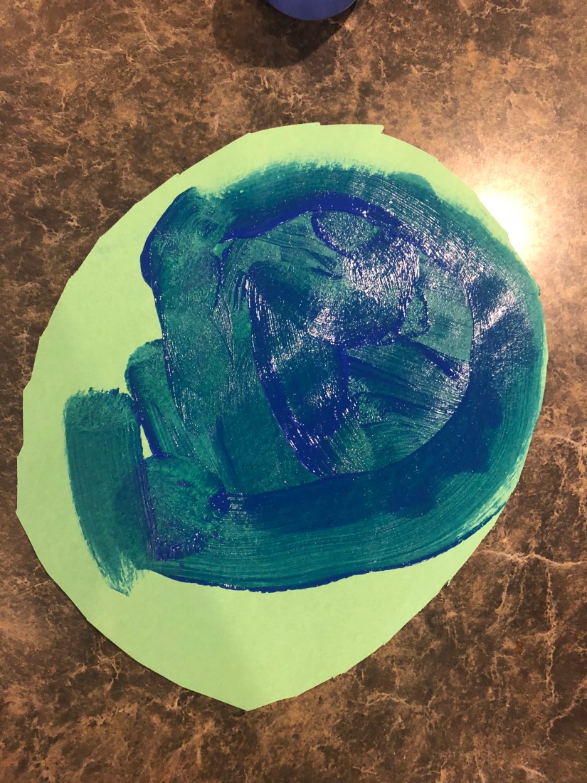 We have moved onto letter E. Our first activity after calendar and prayer was painting the Earth. I did show Sam a model of the Earth, but this is how he chose to paint, and I’m cool with that.