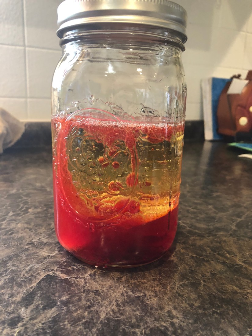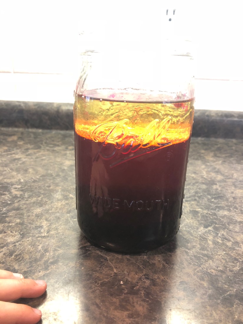 We poured molasses in first. Then we poured in corn syrup. Then red colored water, and oil on top.