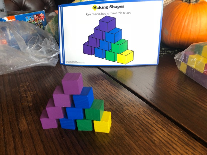 We started our day with these blocks. These blocks are pretty neat because they come with cards that give instructions for the blocks.