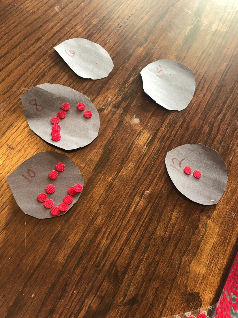 This was lady bug counting. I wrote a number on the black circle, Sam counted out red stickers.