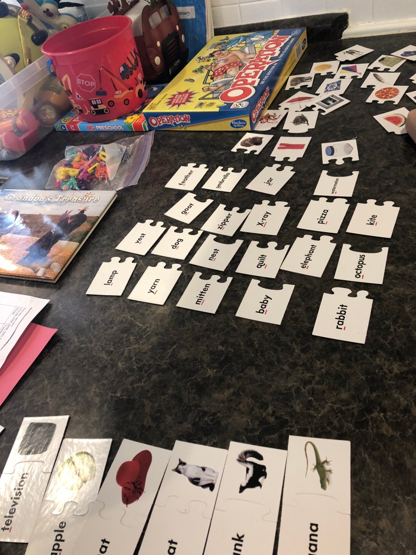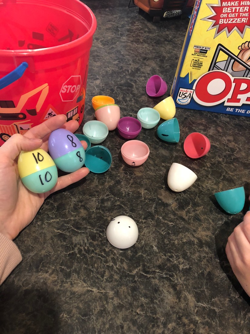 E is for Egg, so we did an Easter Egg match. I just simply wrote numbers on both sides of an egg and Sam matched them.