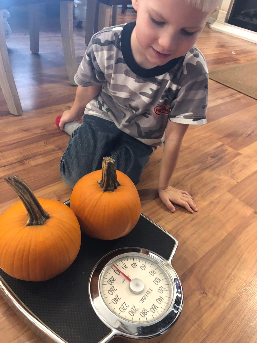 Next we weighed pumpkins. Real pumpkins. Fake pumpkins. More than one pumpkin. Etc.