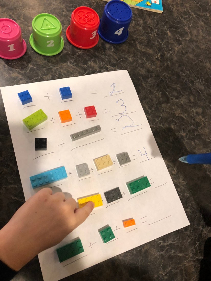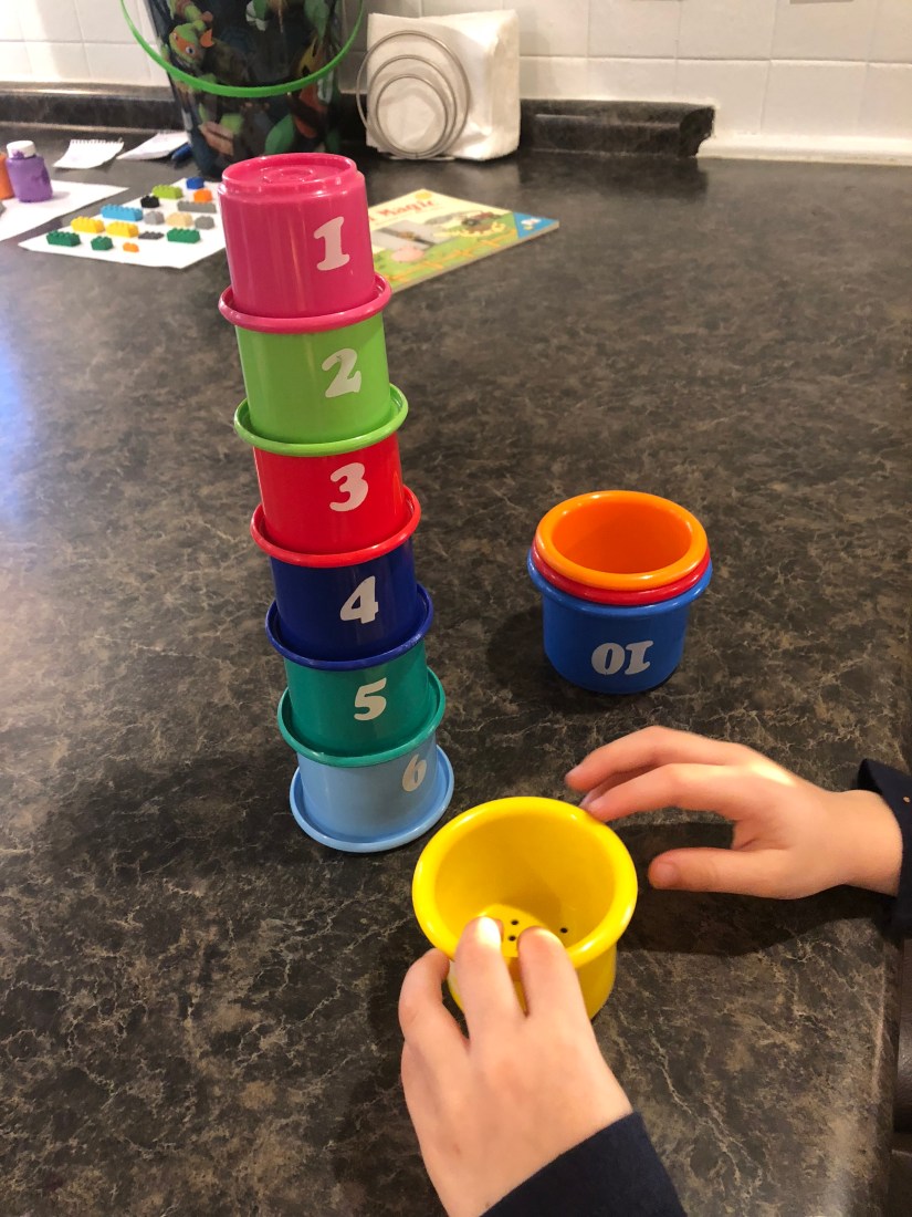 These are technically baby toys, but we turned this into a fun preschool activity. These cups have numbers and letters on them. This was a good recognition warm up activity.