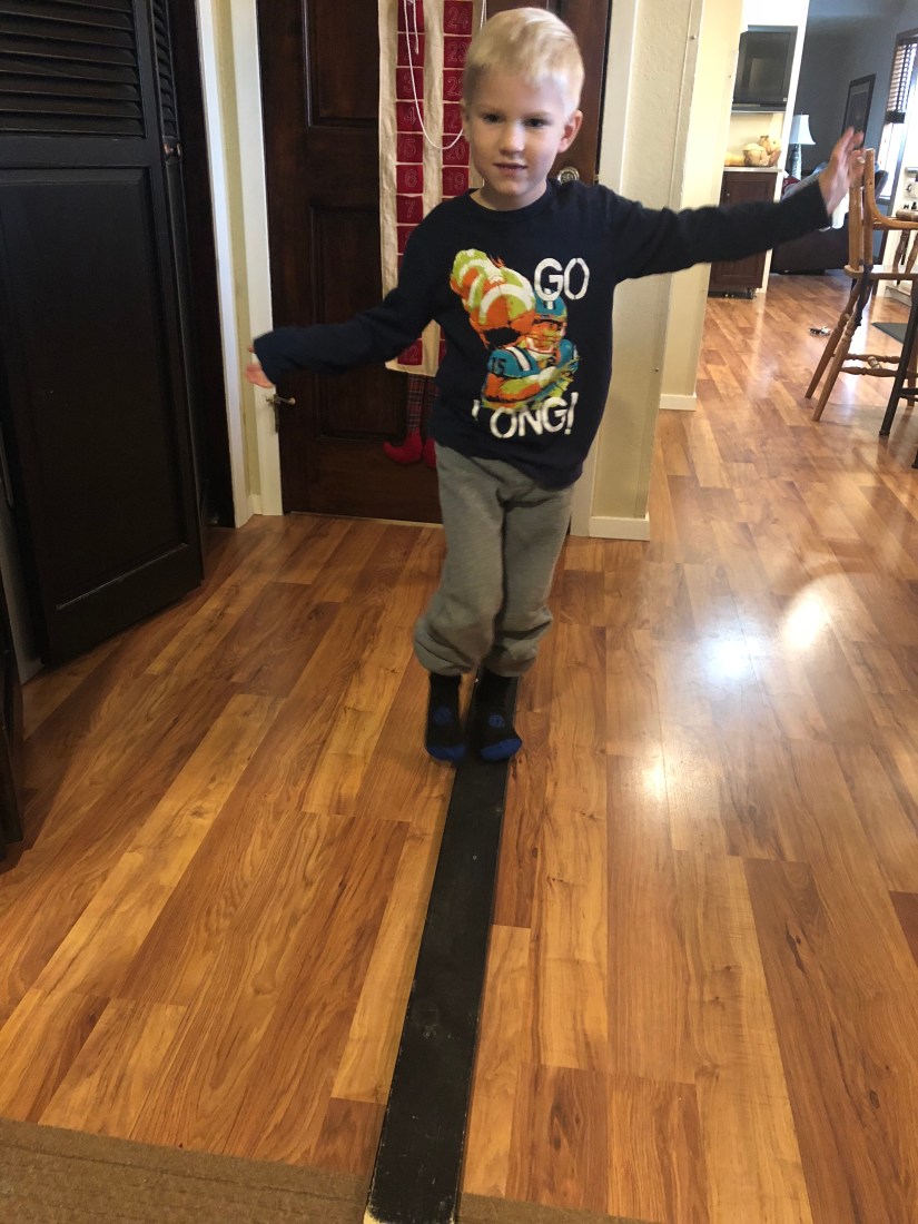 Sam walked on the “balance beam” next. This is a board that has been painted that the kids use as a road. Practicing big motor movements is very important.