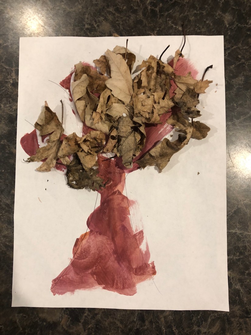 I found a few dead leaves; Sam Painted a tree and glued on some leaves.