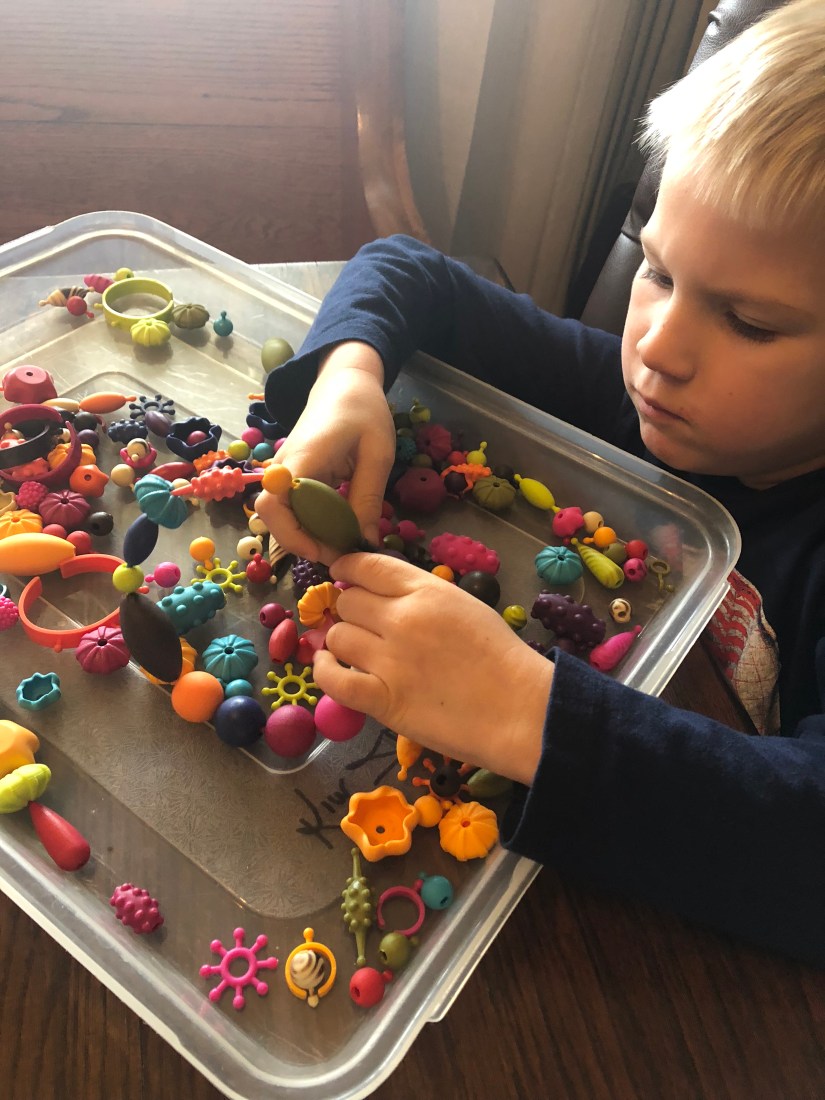 After prayer and calendar, Sam worked with these pop beads. Activities like these strengthen kids’ hands so writing is easier.