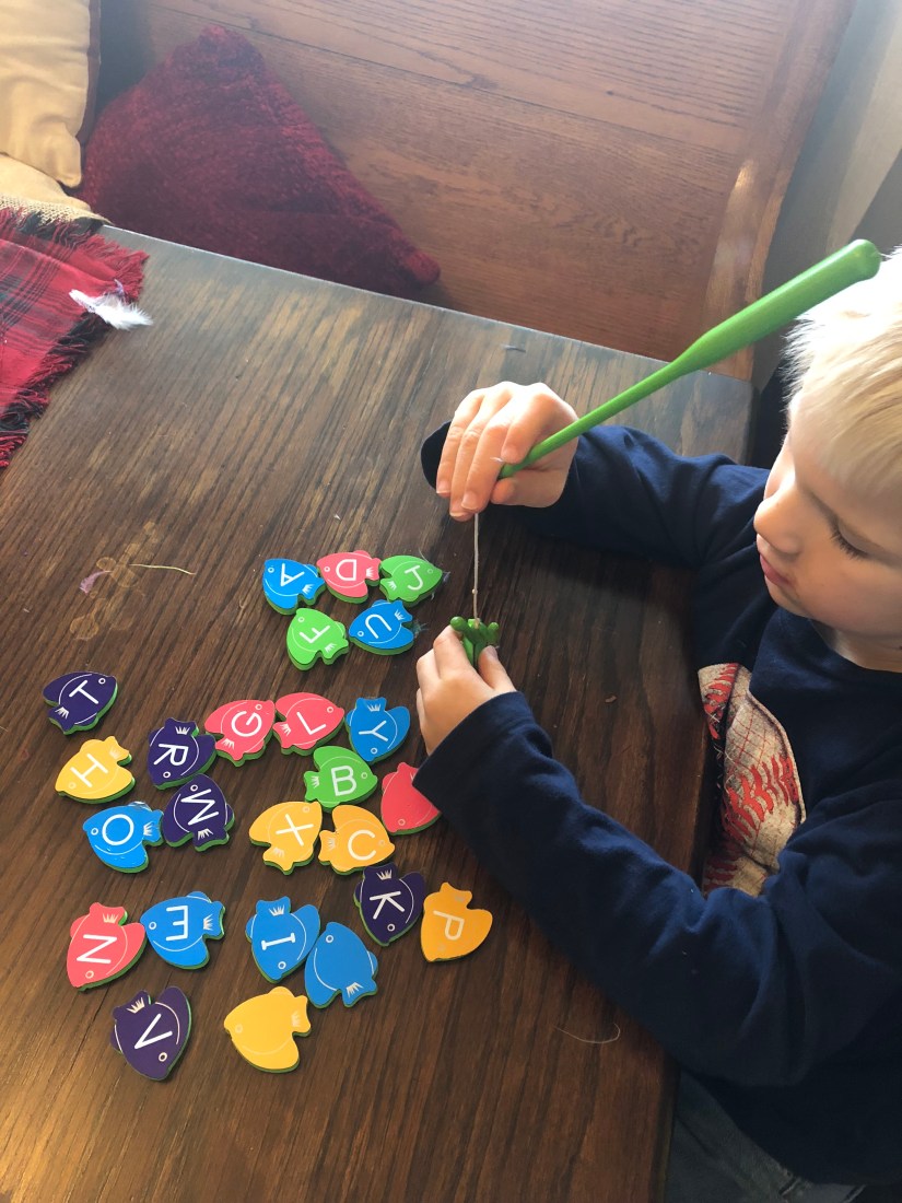 F is for fishing. Sam fished for letters with this magnetic fishing pole. He read every lettered he fished.