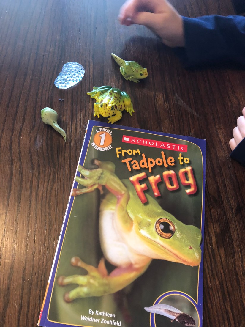 We discussed the lifecycle of a frog next. I read this book and Sam acted out the lifecycle with these toys.