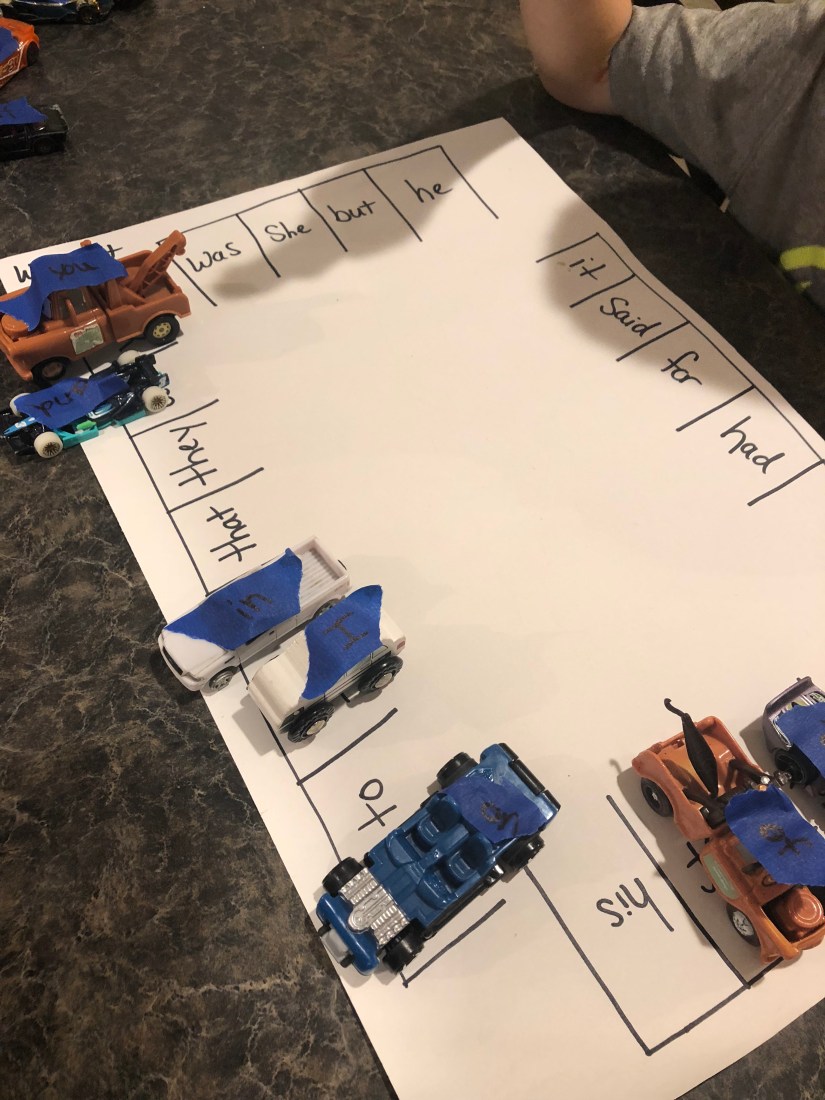 The last thing for the day was site word parking garage. I use painters tape on the cars. Then Sam simply matches them up. I always read the words he picks. He doesn’t know how to read, but he is starting to recognize these words!