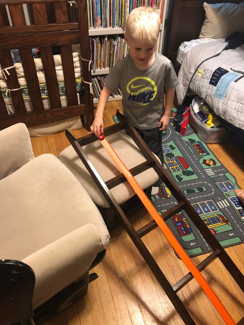 F is for force. We needed to make a ramp in order to demonstrate the force of gravity. Jake made this very creative ramp, which all the boys loved!
