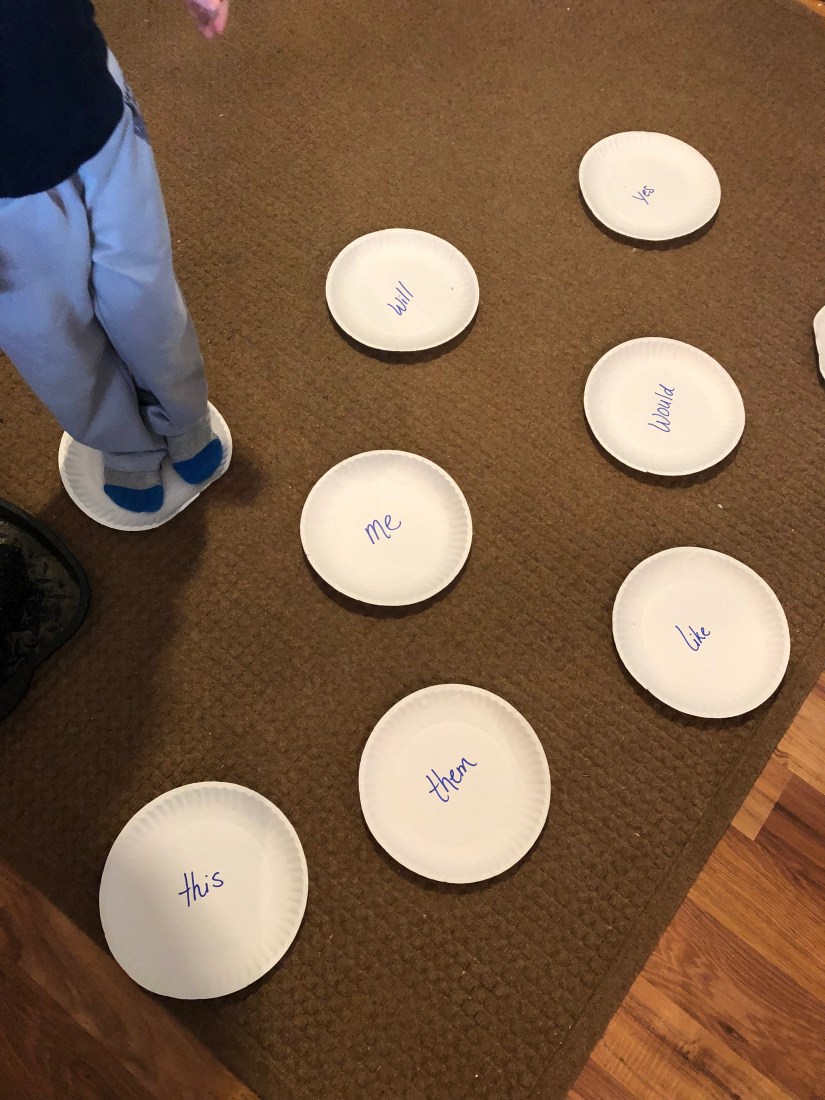 Sight Word Stomp. I yelled out a word, and Sam stomped on it. After each word, I would eliminate the word so there were less to choose from.