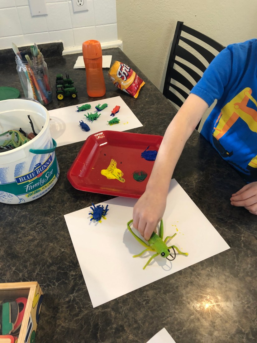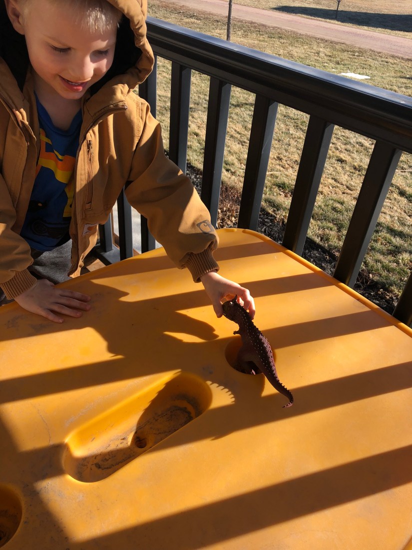 Our first activity for the day was an outdoor animal hunt. I hid a certain amount of dinosaurs and told Sam to go find them.