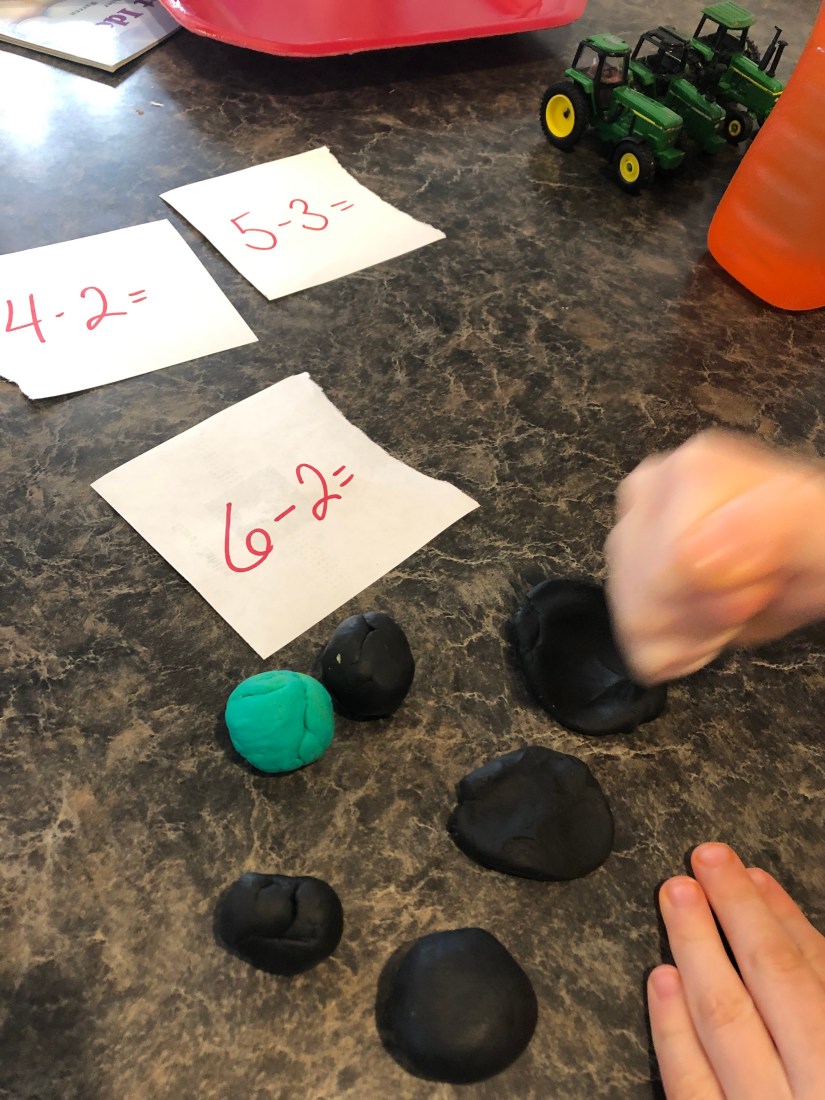Math subtraction smash- write out some facts on cards. Roll the corresponding number of balls of play doh and let the kiddo smash the “take away” number.
